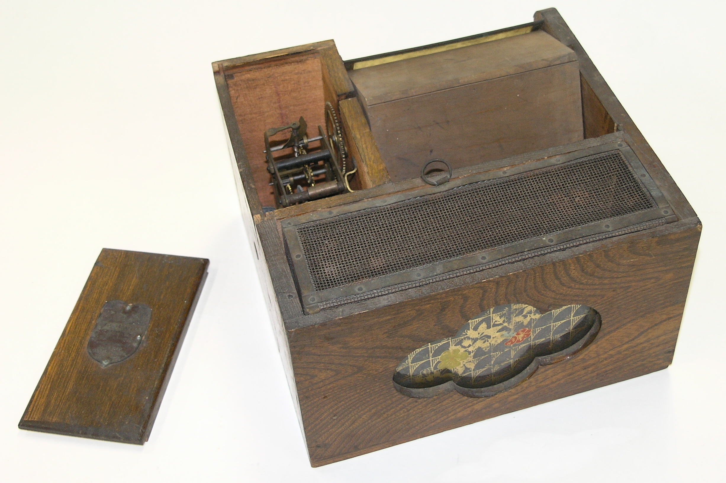| 「ハイトリック」は大正2年1月11日に、兵庫県の堀江松治郎が発明し、特許を取得したハエ取り器です。製造は名古屋市の尾張時計株式会社がおこないました。ゼンマイ仕掛けの仕組みですので、時計屋が製造したというのも、「餅は餅屋に」といったところでしょうか。 そして、このハエ取り器は全国的に大ヒットし、国外へも輸出されました。 このハエ取り器の仕組みは、まず四角柱にハエの好物である酒・酢・砂糖を混ぜたモノを塗っておきます。そこにハエが寄ってきて止まります。四角柱は、ゼンマイ仕掛けにより自動回転しているので、ハエは、図2のように、暗い箱の中へ閉じ込められます。また、網篭側の側面には窓が付いていて、外の光を取り込めるようになっています。ハエは明るい所に集まる習性があるので、自然と網篭の方へ入っていきます。この仕掛けは、1回のネジ巻きで10数時間は動くそうです。 ハエ取り棒やガラス製のハエ取り器とは違い、ハエを生きたまま捕獲できますので、飼育用のカジカ蛙などの餌にすることができます。また、網篭の網面をあぶったり、網篭ごと水につければ、死なせることもできます。 その他、夜間に四角い軸に酒を塗って仕掛けておけば、蚊を取ることもでき、別の用途でも使える優れものです。 なお、展示している「ハイトリック」は、ゼンマイのネジやハエを閉じ込めるための板が無くなってしまっており、完全な形ではありません。 |
