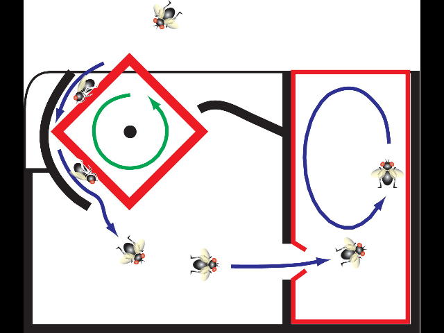 | このハエ取り器はガラス製です。正式名称は不明ですが、「ハエ取り瓶」とも呼ばれていたそうです。 仕組みは、あらかじめ瓶の中に酢・酒・砂糖などを混ぜた水を入れておきます。図1のように瓶の下に餌を置いてハエを誘います。ハエは上に飛び上がり瓶の中に入りますが、出ることができませんので、力尽きて水の中に落ちて死んでしまいます。また、死んだハエを取り出す時は、上部の蓋を外して逆さまにすれば、水と一緒に流れ出てきます。 東日本大震災の時に、被災地のハエ対策で大活躍したペットボトルで作られたハエ取り器にも、このガラス製ハエ取り器の原理が用いられています。 |