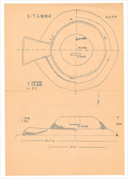 昭和39年(1964)8月11日と12日に作成された木下古墳の略図です。古墳の大きさと埴輪の出土状況(円筒埴輪列が後円部下段肩部、馬形埴輪やその他の形象埴輪片が後円墳頂部から出土)が、記録されています。