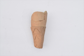 人物埴輪の脚部か腕部であろうと考えられます。馬形埴輪も同時に出土していることから、21・22の人物埴輪は馬子を表しているのではないかと推察されます。