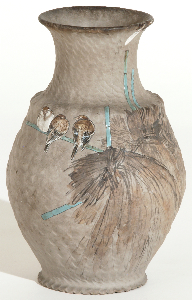 関萬古の花瓶で、秋の収穫時期の、はさ掛けされた稲とはさの竹にとまる雀を描いている。