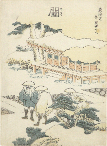 館蔵資料葛飾北斎の風景画、「東海道五十三次 絵本駅路鈴」シリーズの関である。冬の雪の日の地蔵院前を描いており、描かれている旅人の蓑や傘にも雪が積もっている。