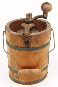 昔のアイスクリームをつくる夏に使われた道具である。桶の中に氷と塩を入れて、アイスクリームの材料の入った容器を桶の中でぐるぐる回せば、アイスクリームのできあがり。