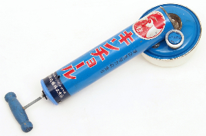 大日本除虫菊(株)製の蚊取り噴霧器。商品名は「キンチョール」とある。使い方は、先についているタンクの部分に殺虫剤を入れ、水鉄砲のように蚊に向けて噴霧する。蚊のいる夏に使われた道具である。