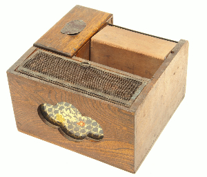 昭和53年(1978)まで使用されていた携帯用懐炉である。現在の使い捨てのカイロとは違い、昔は、専用ケースの中に、火をつけた懐炉灰と呼ばれる燃料を入れて使用していた。懐炉灰は、よもぎ、ごま、麻殻、藁などを焼いて紙につめたものである。
