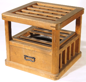 置炬燵より後に登場した櫓のついた炬燵である。使い方は置炬燵と同じだが、置炬燵は、火鉢を出し入れする部分が開いているので、うっかり足を入れる危険があったが、これは、櫓で全面を覆っているので、置炬燵に比べて安全に使用できるようになっている。