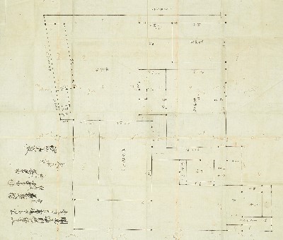 この図は、日野屋が保管していた屋敷の家相図で、「安政二乙卯年八月稿図 明治八年乙亥一月訂正図書」と書かれている。つまり、まだ近江屋久兵衛(西谷家)が借りている頃に作成された図面を、明治8年(1875)に訂正したものなんだね。この家相図をみると、鈴木清兵衛が若林家と仮約定した文久元年(1861)の図面(3-4)より、南へ敷地広がっているのがわかるね。広がったのは、ちょうど大きめの紙が貼ってある部分だよ。そして、醤油蔵などの醸造場に関わる部分も、東側の空地だった場所へ移っているんだ。黄色で表した醸造場には醤油蔵である「二階蔵」の他に、「室」や「粕入穴」も書かれているね。