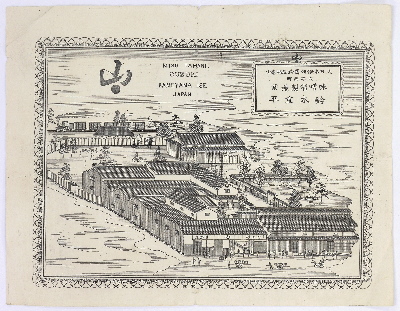 このしおりは、日野屋の宣伝広告だね。この絵は、明治8年(1875)の家相図(3-6)とは間取りが一致しないけれど、絵にも描かれている煙突は実際にあって、平成初期頃まで建てられていたんだ。日野屋は、昭和時代には鈴木醤油株式会社と名前を変えて、昭和64年まで営業したんだよ。