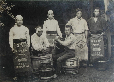 この写真をよくみると、「笑顔」のラベルを貼った樽に腰掛けた青年が、樽の上で胡座をかいている男性に通い徳利で酒を注いでいるよ。
