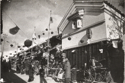 この写真は、店の開業祝いなのかな。店の前には醤油樽を積んだ大八車があって、その奥には法被を着た従業員の姿も見えるよ。配達の出発式かもしれないね。