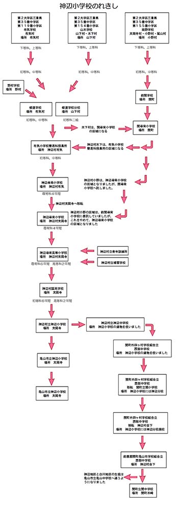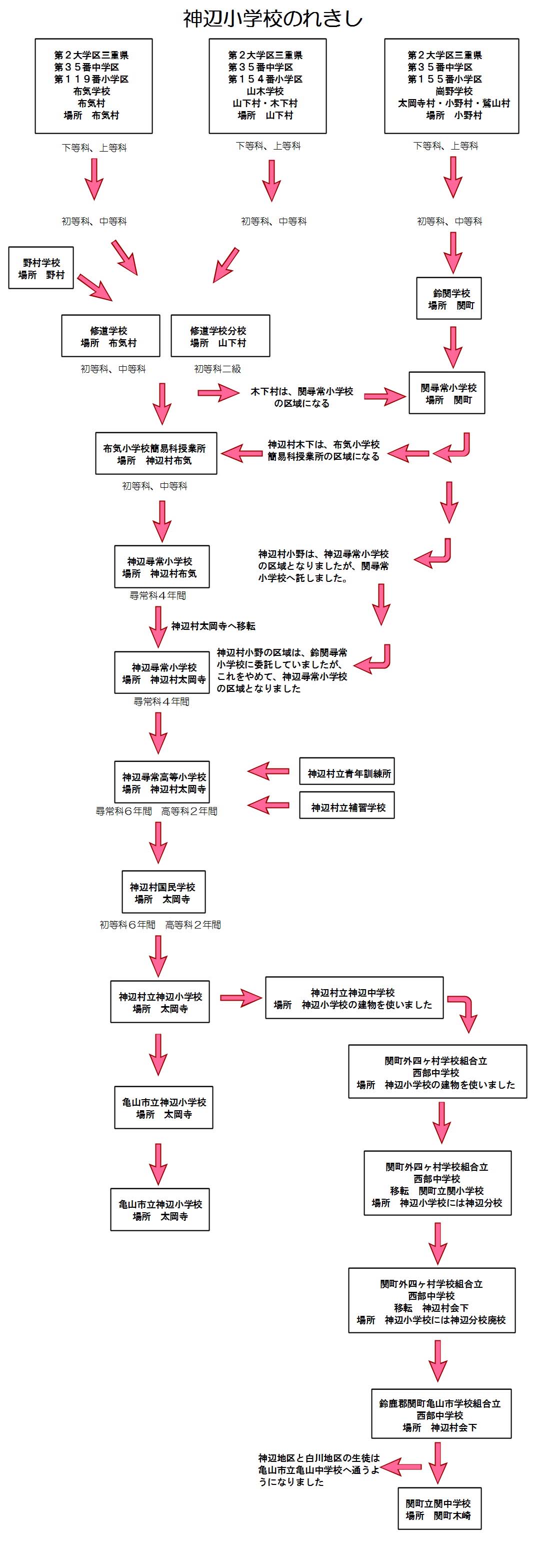 神辺尋常高等小学校(かんべむらじんじょうこうとうしょうがっこう)は、三重県鈴鹿郡神辺村国民学校(みえけんすずかぐんかんべこくみんがっこう)となりました。