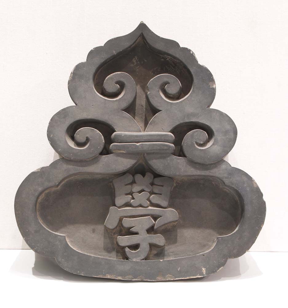 校舎(こうしゃ)の宝珠形(ほうじゅがた)の鬼瓦(おにがわら)