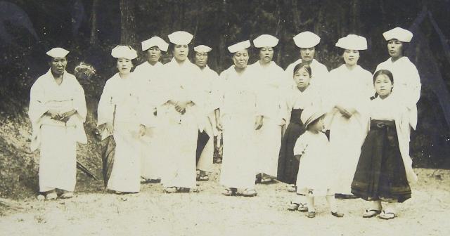 しかし、昭和時代(しょうわじだい)のはじめ(1926年(ねん))ころには、女性(じょせい)のも服(ふく)は和服(わふく)で、白(しろ)い着物(きもの)を着(き)て、頭(あたま)に白(しろ)いかぶりものをかぶることが多(おお)かったようです。