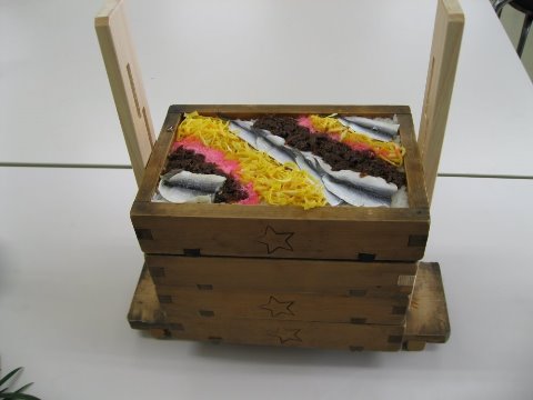 市内(しない)のすしは、おもに押(お)しずし、巻(ま)きずし、いなりずし、にぎりずしでした。特(とく)に、押(お)しずしはそれを作(つく)る箱(はこ)を重(かさ)ねたような道具(どうぐ)があり、一度(いちど)にたくさんの押(お)しずしを作(つく)ることができました。