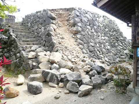 2007年(ねん)の地震(じしん)で崩(くず)れた亀山城(かめやまじょう)の石垣(いしがき)