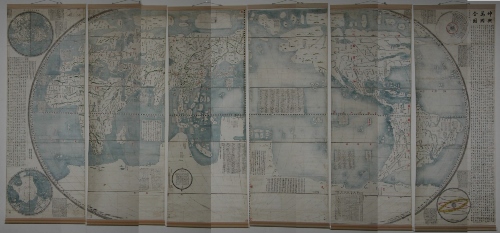 市域(しいき)に残(のこ)る、江戸時代(えどじだい)の天文学(てんもんがく)の資料(しりょう)として、坤輿万国全図(こんよばんこくぜんず)があります。これは、天文学(てんもんがく)を使(つか)って書(か)かれた世界地図(せかいちず)で、天文学(てんもんがく)の学(まな)んだときには、最後(さいご)にこの図(ず)を書(か)き写(うつ)していたと言(い)われています。